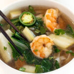 Making Shrimp Pho at home is a lot easier to make than you think! This recipe is ready in under 30 minutes and features flavorful spiced broth, steamed shrimp, bok choy, rice noodles and fresh cilantro!