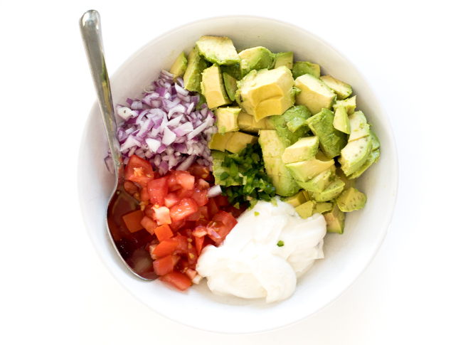 I discovered that the secret is Greek yogurt, which keeps the guacamole creamy, lowers calories, and also adds tons of protein. The Greek yogurt adds about 6 grams of protein to this recipe and gives it a super creamy texture.