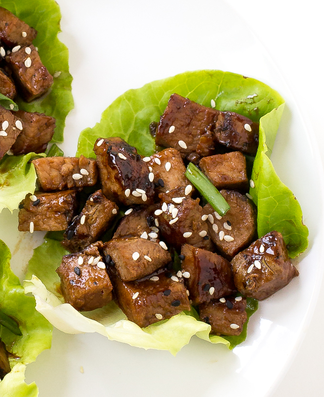 First, I coated the chicken in cornstarch, and then pan fried it over really high heat, which keeps the chicken really juicy and also helps to thicken up the sauce. Speaking of the sauce, I mixed together soy sauce, brown sugar, rice wine vinegar, sesame oil and hoisin sauce to create this mouthwatering glaze. I suggest using low-sodium soy sauce in this dish to control the salt level, but you can always add some water to help with the salt if you only have regular soy sauce.