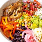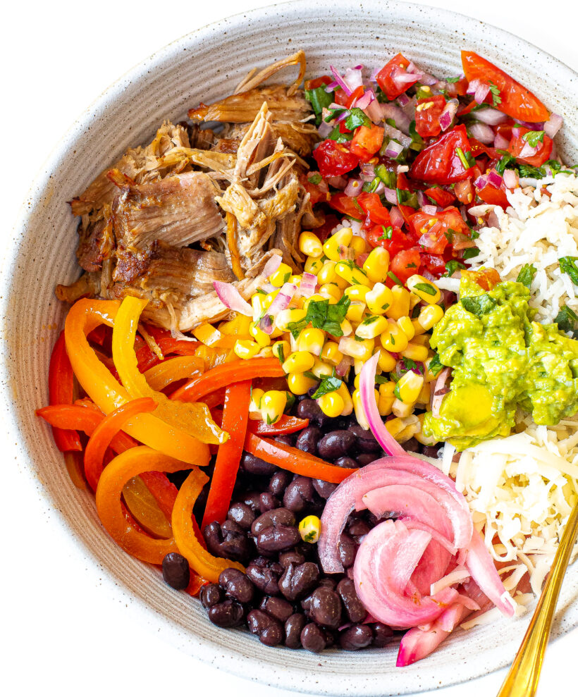 Skip the expensive takeout and make this homemade Carnitas Burrito Bowl instead! This Chipotle copycat is packed with all your favorites: tender, slow-cooked shredded carnitas, zesty cilantro lime rice and all of the tasty, fresh toppings. It’s a flavor-packed meal perfect for weeknight dinners!