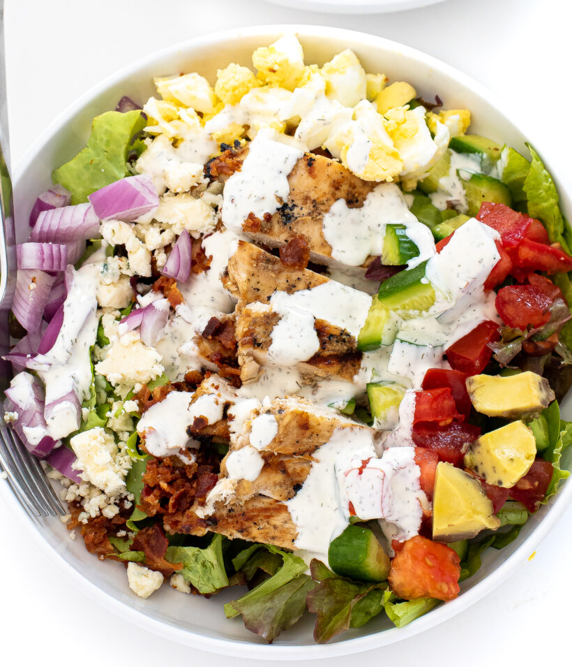 This Grilled Chicken Cobb Salad recipe consists of delicious and simple ingredients like mixed greens, chicken breasts, crumbled bacon, fresh tomatoes, and blue cheese. Drizzled with a homemade ranch dressing, this is a perfect summertime meal!