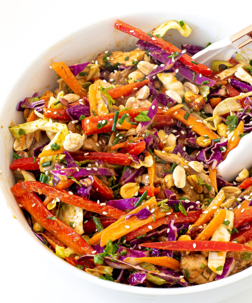 Thai Chicken Salad with peanut dressing is a tantalizing blend of crisp vegetables and tender chicken all tossed in a zesty dressing! With its perfect balance of sweet, savory, sour and spicy flavors, it's a refreshing and satisfying dish inspired by Thai cuisine!