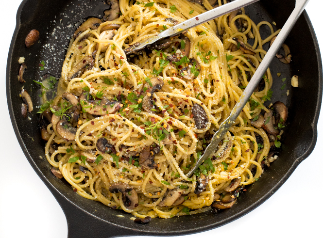 - Add the pasta to the skillet with the mushrooms and garlic mixture. Add in the egg / cheese mixture and 1/4 cup of the pasta water. Slowly toss the pasta until the pasta is coated. Add more pasta water if needed. Add in fresh parsley and season with salt and pepper to taste. Serve each bowl with crushed red pepper flakes, parmesan cheese, and a drizzle of olive oil for serving!