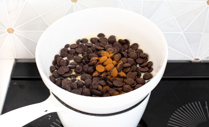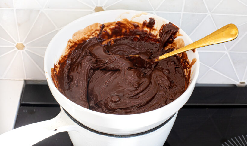 - Melt chocolate: Secondly, add all of the ingredients to a medium bowl and place over a pot filled about halfway with lightly simmering water. You do not want the water and bowl to touch. This method is called a “bain-marie” or “double boiler”. Whisk until the chocolate is melted, which will take about 6 minutes. The mixture will be very thick.