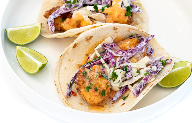- You can either toss the shrimp in the bang bang sauce or place the shrimp on the tacos then drizzle with sauce! Next layer coleslaw on top and fresh cilantro if desired. I also like to serve lime wedges on the plate for squeezing on top.