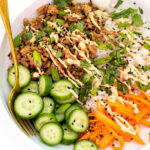 These Banh Mi Bowls are an iconic twist on a traditional banh mi sandwich, featuring savory ground chicken, hot rice, pickled carrots, crisp vegetables and a homemade spicy mayo sauce!