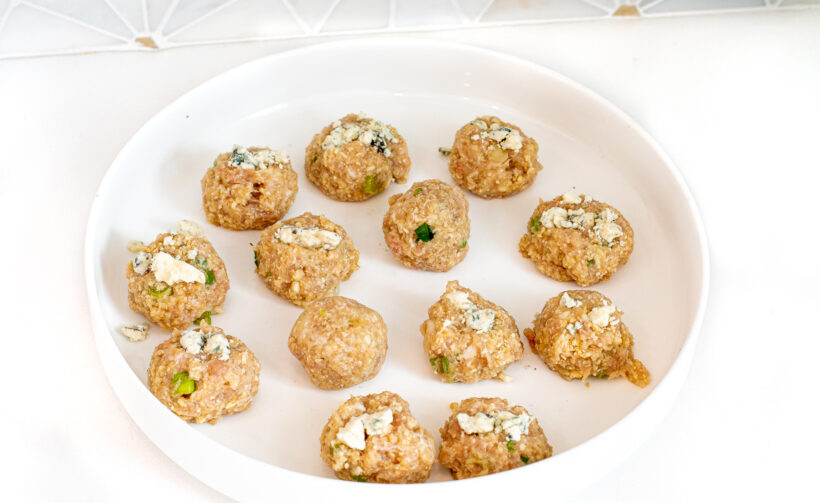 - Portion into meatballs (I got about 22-24 meatballs). I find just using your hands works best. You can even dampen your hands to make them easier to roll.Stuff a couple of blue cheese crumbles into the middle of each meatballs. Pinch some of the meatball around the cheese to cover it up and reroll them.