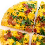 Breakfast pizza with eggs, cheese, bacon and herbs.