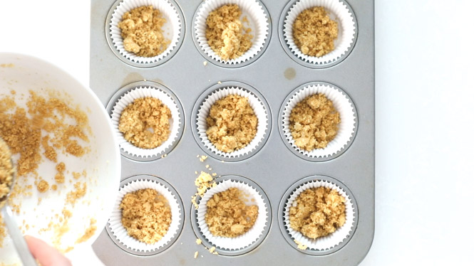 • Preheat oven to 325 degrees. Line a regular size muffin pan with paper liners. (I recommend using the paper liners over foil). Combine graham cracker, butter and sugar in a small bowl. Texture should be similar to wet sand. Divide crust evenly into the bottom of the lined muffin tin. Bake for 5-6 minutes or until golden brown. Take out of the oven and cool completely.
