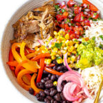- Put the Bowls Together: Start by layering the cilantro lime rice on top then adding carnitas, beans, cheese, pico, corn salsa, guacamole, pickled onions and sour cream.