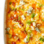 - For Serving – Blue cheese crumbles, extra buffalo sauce, and green onions are added before serving. You could even do a drizzle of homemade ranch dressing on top.