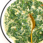 This Creamed Spinach transforms humble spinach into a luxurious creamy side dish that even picky eaters will enjoy! Serve this creamed spinach with a garlic cream sauce at your holiday table! Ready in less than 30 minutes!