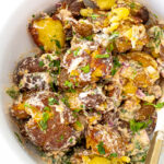 This Crispy Roasted Potato Salad is a delicious twist on the classic potato salad! The potatoes are roasted to perfection to add a little crunch to the creamy blend of sour cream, mayonnaise, Dijon mustard, and pickles. It’s the perfect side to complete any meal!
