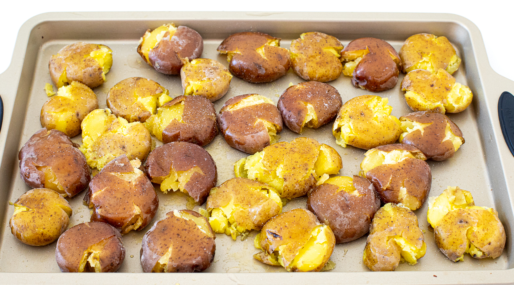 - Transfer the potatoes to a baking sheet and drizzle with olive oil, salt and pepper. Using a small jar or cup, smash each potato to flatten it.