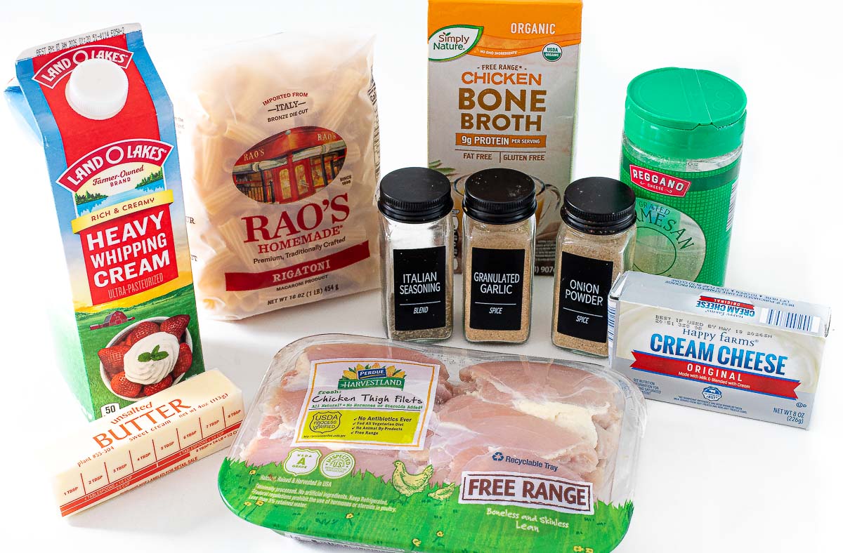 - To a crockpot, add all of the ingredients except the dry pasta — chicken thighs, heavy cream, chicken broth, cream cheese, butter and seasonings. Cook on HIGH for 2 hours, or until chicken is tender and fully cooked.