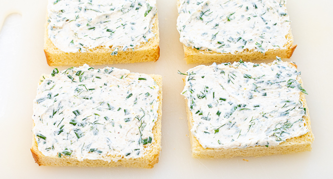 • Spread herb cream cheese on both sides of the bread. This creates a barrier between the cucumbers and the bread so the sandwich does not get soggy.