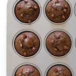 To make my double chocolate chip muffins rise higher, I begin baking them at 400°F, and then after 10 minutes, I reduce the heat to 350°F. This gives the muffins a little extra time to bake, so they can rise higher without drying out.