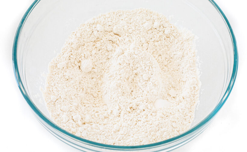 • In a large mixing bowl combine flour, baking powder, baking soda and salt. Set aside.
