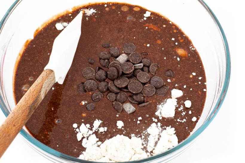 1. Next add the wet ingredients and the chocolate chips to the dry ingredients. Fold with a rubber spatula to combine. Do not over mix.