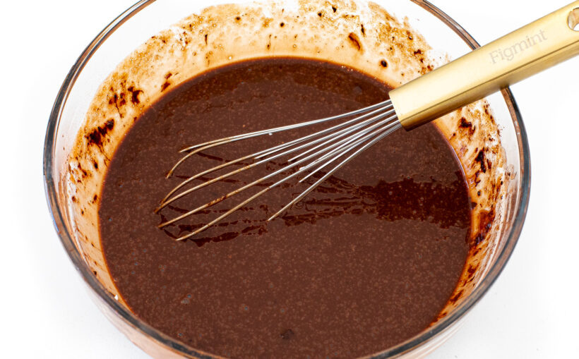 • In a medium bowl combine brown sugar, sour cream or greek yogurt, vegetable oil, vanilla eggs, hot coffee and cocoa powder.