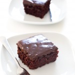 This easy chocolate cake recipe yields a rich moist chocolate cake made in a 9 x 9 pan with a simple ganache frosting. It’s the perfect dessert for any occasion or even just a weekday!