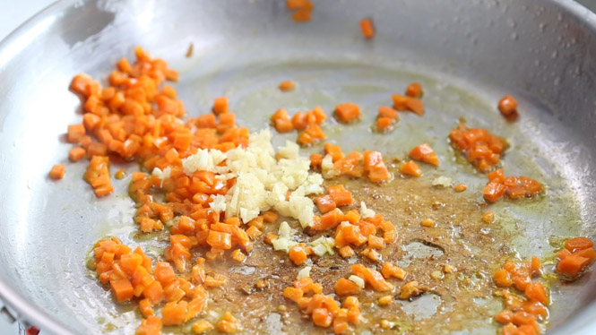 - Add in the remaining 1 tablespoon of oil to the same pan. Add in the carrots and saute for 4-5 minutes or until tender. Stir in garlic and cook for one minute.