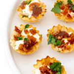 - Sprinkle with bacon then bake for 8-10 minutes or until the goat cheese looks melty and the phyllo cups start to get some color on them.