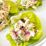 Instead of making a traditional chicken salad with mayo, I have started making Greek yogurt chicken salad! It is creamier and richer, with fewer calories and higher protein! Whether you aren’t a fan of mayonnaise, or you have an egg allergy, this Greek yogurt chicken salad is a delicious option! You would never know this is made with yogurt! My husband was so surprised.