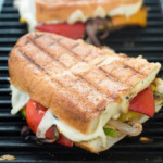 I don’t have a panini press or an outdoor grill. I instead use a indoor cast iron grill to cook the vegetables. After I assemble the sandwiches I place them back on the grill and weigh the sandwich down with a large cast iron skillet. I place parchment paper between the sandwich and the pan to keep them from sticking. This gives the sandwich a nice crunch when you bite into it and ensures the cheese is nice and melted when it’s time to serve.