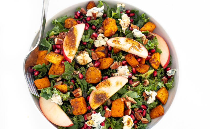 - Start by adding shredded kale to a large bowl. Top with pecans, blue cheese, pomegranate seeds, sliced apples and 1/4 cup sweet potatoes.