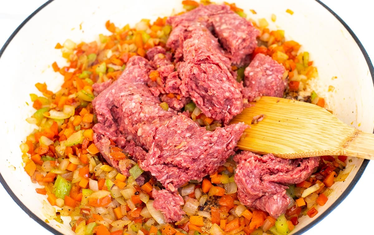 - Heat oil in a large skillet over medium high heat.Once hot add in onions, bell peppers, carrots and celery and sauté for 4-5 minutes, or until softened and beginning to caramelize.Add in beef, and cook until browned.