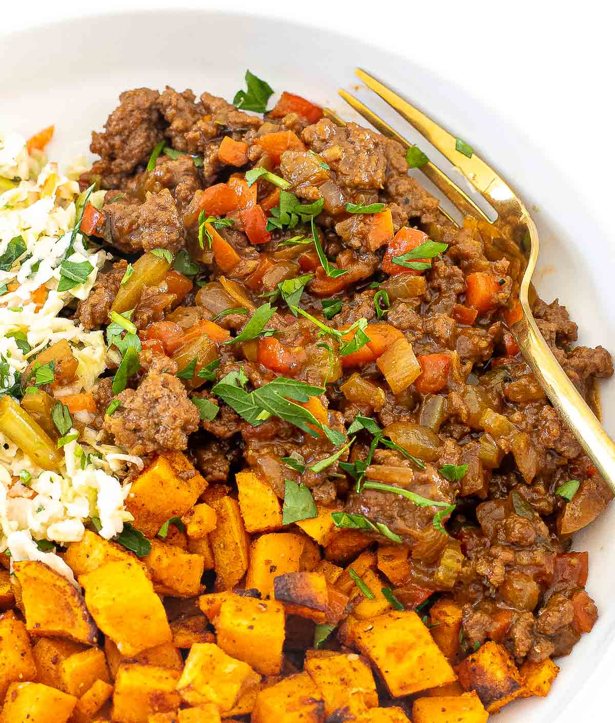 - Assemble: To serve, divide the Sloppy Joe mixture between bowls or meal prep containers and top with roasted sweet potatoes and coleslaw. Perfect for lunch, dinner, or meal prep!