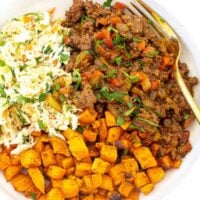 These Sloppy Joe Bowls are loaded with 20 grams of protein per bowl! Saucy beef gets piled into bowls with crispy roasted sweet potatoes and a tangy homemade coleslaw recipe for the perfect balance of sweet, savory, and crunchy!
