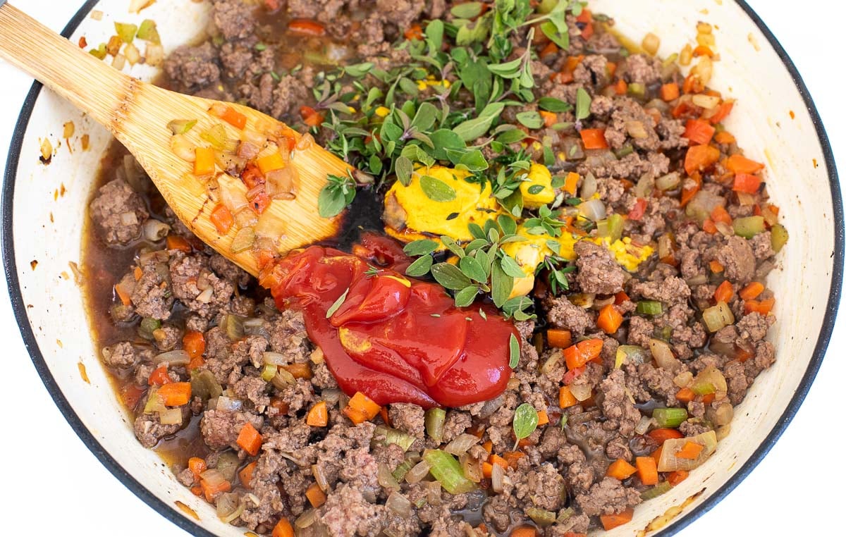 - Add Flavorings and Simmer: Season with salt and pepper, then stir in ketchup, mustard, molasses, apple cider, apple cider vinegar, Worcestershire sauce, thyme, and oregano. Simmer for 5 minutes until thickened, then set aside until ready to assemble.
