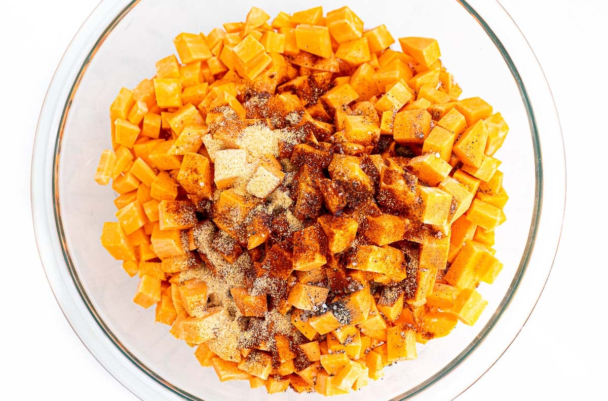 - Season Sweet Potatoes: Preheat oven to 425°F. Add sweet potatoes, olive oil, salt, pepper, onion powder, garlic powder, and paprika to a medium bowl and toss to combine.