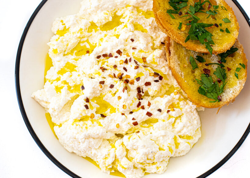 - Transfer the ricotta to a bowl or plate and drizzle with olive oil. If serving as a dip sprinkle with salt and pepper and crushed red pepper flakes. Use as your normally would for store-bought ricotta. Enjoy!