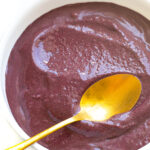 Acai smoothie bowl base in the blender after being blended with a spoon showing some of it to the camera.