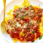 Homemade Bolognese Sauce is a rich, hearty meat sauce that is slow simmered to perfection to develop deep, savory flavors! Perfect for a comforting meal, served with thick pappardelle noodles and parmesan cheese on top!