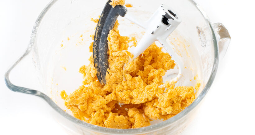 - Add the butter, shredded cheese, and salt to a stand mixer with the paddle attachment. Mix for one minute then slowly start to add in the flour. The mixture will look dry.