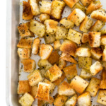 If you’ve never made your own homemade croutons from scratch, then this recipe is the perfect one to make as your first attempt! I love making these at the start of the week to use on salads or in soups (or even just to snack on). They’re crispy and full of flavor. The perfect crunchy addition to so many of my favorite recipes!
