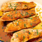I add the salmon skin side down cook then flip and cook more. I then add in the sauce (you can leave the salmon as is or flip when adding the sauce)