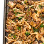 - Shred / Broil: Transfer the chicken to a large sheet tray and shred with two forks. Add 1/4 cup of the cooking liquid on top and broil for 5 minutes or until desired crispiness. This is such an important step! I love broiling the chicken. It makes it super crisp and golden brown.