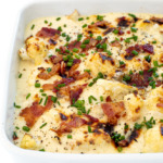For this bake, I don’t mash the cauliflower like I would potatoes. I keep the roasted cauliflower whole and add a creamy, cheesy sauce on top. Then top it with more cheese, bacon and chives and voila! You have a lovely side for a variety of different meals.