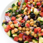 For this salad I wanted to incorporate cucumbers and cherry tomatoes which we have a lot of right now in the garden. I loaded this salad up with tons of greek flavors! Tomatoes, olives, red onions, chickpeas and cucumbers are all tossed together with a drizzle of lemon juice and olive oil. It’s light, healthy and uses up a lot of summer vegetables and herbs.