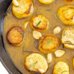 Melting potatoes in a skillet with garlic cloves, rosemary and a gravy sauce.