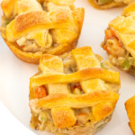 Mini Chicken Pot Pies make a fun dinner idea that comes together in minutes thanks to leftover rotisserie chicken and crescent roll dough! The shredded chicken is tossed with veggies in a homemade cream sauce then topped with flaky crescent dough. Kids will love these!