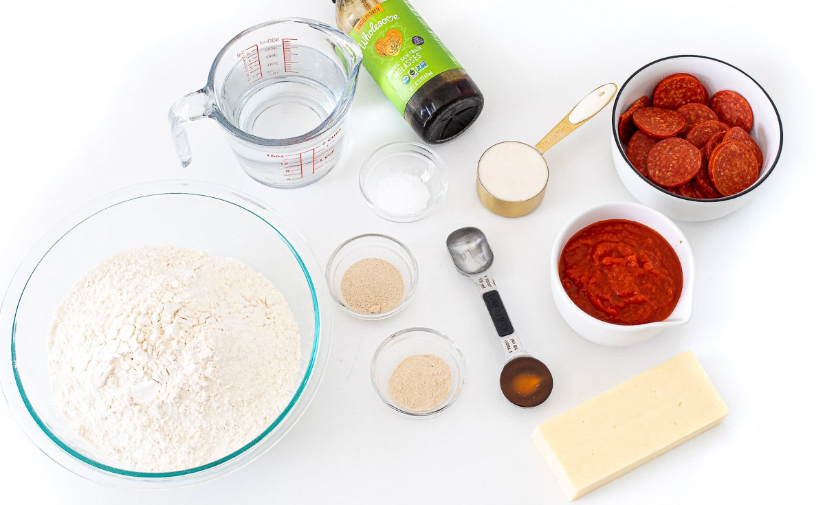 Bring 3 quarts of water to a boil and stir in the molasses. Boil the bagels 8 at a time for 1 minute, gently stirring halfway through. Transfer to a cornmeal-dusted silicone mat and bake at 500°F for 12–15 minutes. Let cool before slicing and topping with tomato sauce, diced mozzarella, and pepperoni.