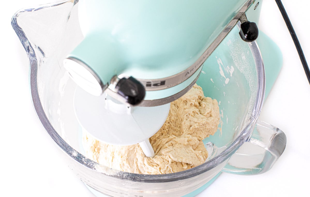 - Add in flour and mix on low speed just until dough forms a ball. Turn off mixer and let the dough rest for 10 minutes.