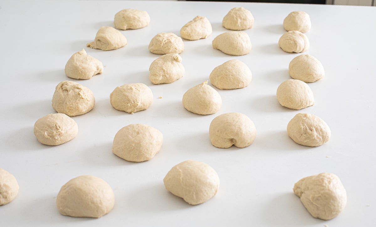 - Divide dough into 24 small balls. Roll each ball of dough into a small disk about 4 inches in diameter then roll into a tube. Roll the dough tube until it reaches about 6 inches in length. Wrap around 2 fingers overlapping dough and roll seam on the counter. Place bagels on a sheet pan.