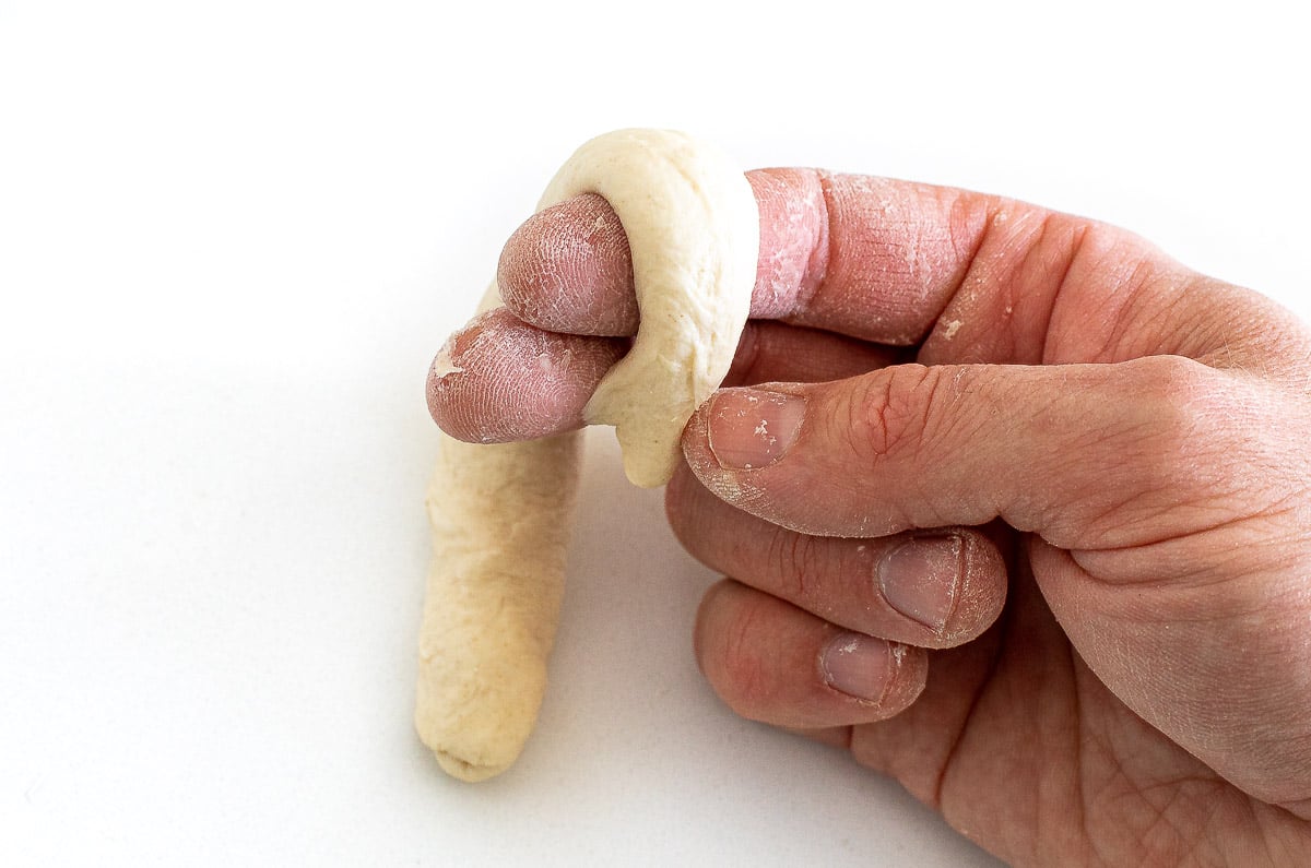 Roll each ball of dough into a small disk about 4 inches in diameter then roll into a tube. Roll the dough tube till it reaches about 6 inches in length.